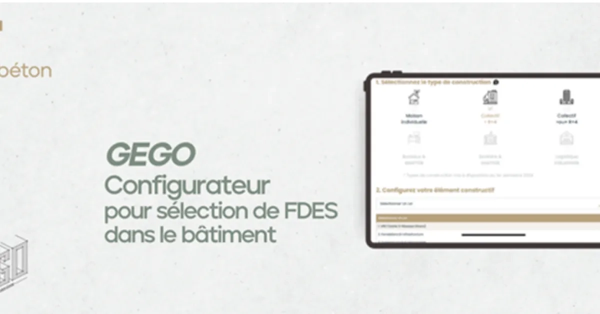 Le simulateur GEGO (Guide Environnemental du Gros Œuvre) s'enrichit ! Nous venons d'y intégrer les dernières FDES béton, afin de vous offrir une base de données toujours plus complète et actualisée pour vos projets. Ce simulateur est conçu pour simplifier le processus de sélection des Fiches de Déclaration Environnementale et Sanitaire (FDES) correspondant à des composants ou procédés constructifs pour différents types de bâtiments, notamment en béton coulé en place ou préfabriqué.