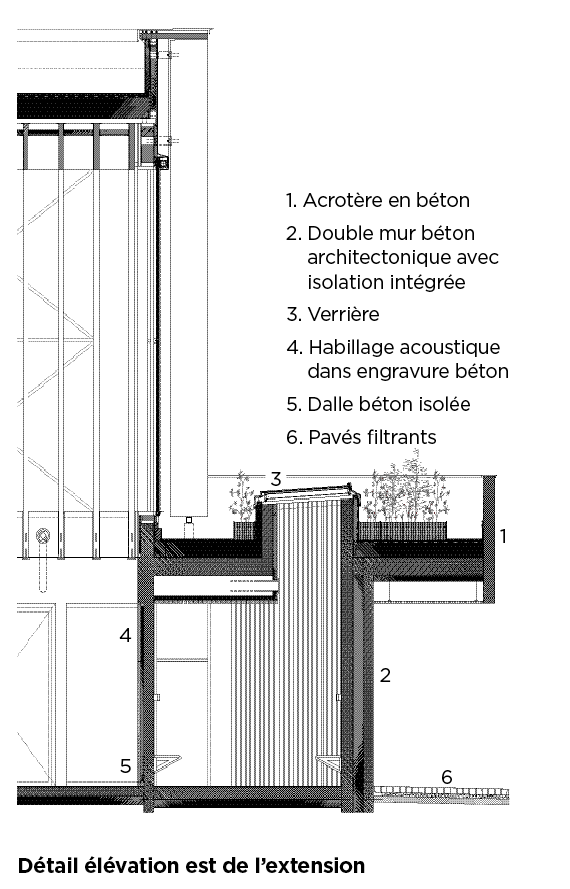 Pour conserver la peau du béton apparente, les parois extérieures qui composent le socle sont constituées de doubles murs prenant en sandwich l’isolant thermique. Ils ont été coulés en place comme quasi tous les éléments en béton. Seuls les panneaux composant le bandeau périphérique ont été préfabriqués mais sur site.