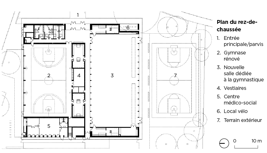 Ce respect de l’environnement ne se cantonne pas à la préservation des espaces verts. Il imprime l’ensemble du projet qui a obtenu les labels E3C1 pour la partie neuve et BBC rénovation pour l’existant, un niveau de performance qui s’explique notamment par la compacité du bâtiment et l’importance de son isolation. Il faut ajouter à cela les panneaux solaires qui s’étendent désormais sur la toiture de l’ancien gymnase – une superficie suffisante pour couvrir plus que les besoins de l’équipement. Les autres toitures sont végétalisées, elles participent à l’infiltration des eaux de pluie. Un bassin assure la récupération éventuelle du trop-plein qui sert à l’arrosage des surfaces plantées.