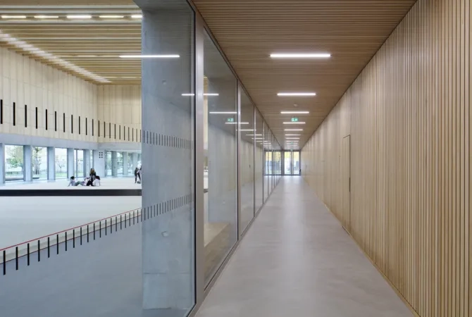 En effet, les volumes vous accueillent et vous enveloppent. C’est en partie dû au choix des matériaux, l’équipement étant quasi exclusivement réalisé en béton et en bois. Ces deux matières brutes et vivantes donnent de l’épaisseur et de la texture aux différentes surfaces. Il en résulte une atmosphère vibrante et apaisante, un effet renforcé par l’abondance de lumière naturelle qui vient mettre en valeur nuances et reliefs. Un des autres aspects plaisants à l’œil relève du rythme dégagé par le choix des trames et l’équilibre qui s’en dégage. Tout le travail a consisté à trouver un dénominateur commun entre celles applicables au bois et au béton pour créer une géométrie qui soit efficiente techniquement tout en étant harmonieuse, en particulier dans la nouvelle salle. Ce savant dosage entre contrainte et liberté découle d’un réglage fin et d’un jeu subtil sur les épaisseurs.
