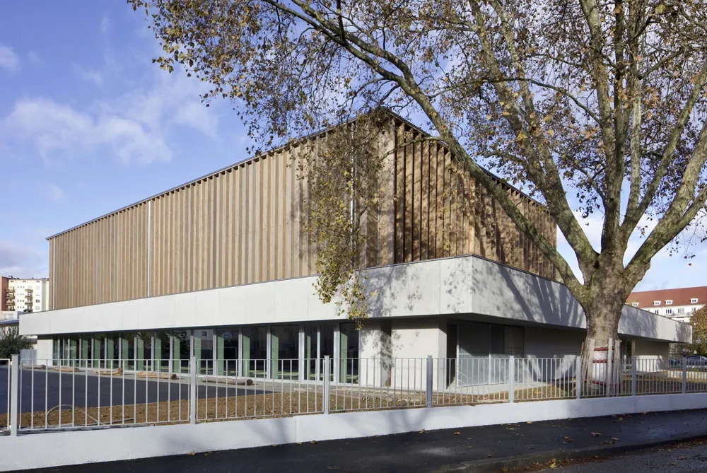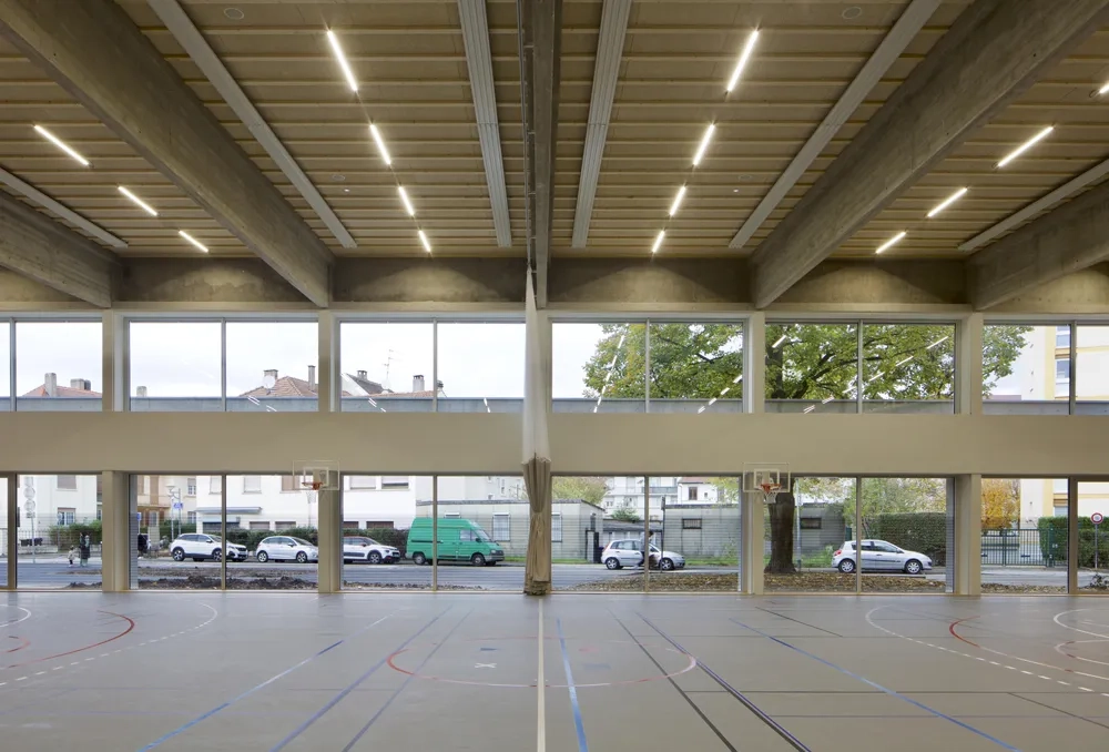 Situé au cœur du Neudorf, un quartier du sud de Strasbourg proche du centre-ville comme de l’université, l’actuel gymnase Albert-Le-Grand pourrait s’apparenter à la rencontre de deux volontés, celle de la ville et celle des architectes qui ont conçu sa restructuration et son extension. Leur objectif commun ? Offrir aux usagers un équipement qui réponde le plus précisément possible à leurs besoins tout en préservant l’environnement. Construit initialement dans les années 1960, il ne comportait à l’origine qu’une seule grande salle multisport posée sur une large surface d’enrobé utilisée comme aire de sport extérieure. Un dispositif classique devenu obsolète qu’il était urgent de transformer. La position de l’équipement à proximité de la trame verte et bleue – un réseau de réservoirs de biodiversité sillonnant la ville – décuplait l’importance d’une prise en compte environnementale.