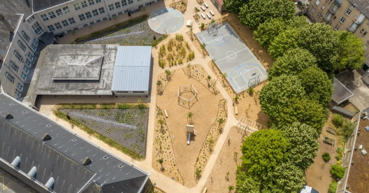 Ce projet de réhabilitation de la cour de l’école Raymond-Poincaré à Thionville est un exemple remarquable de l’utilisation de matériaux béton innovants et durables pour améliorer la résilience urbaine. En intégrant des solutions de désimperméabilisation et de gestion des eaux pluviales, il contribue à un environnement scolaire plus agréable et sécurisé par temps humide et il permet de restaurer un cycle de l’eau direct par infiltration, sans ruissellement et de manière durable. Le béton drainant se révèle être une solution efficace pour désimperméabiliser les surfaces urbaines. Contrairement aux revêtements denses traditionnels (qui retiennent l’eau, contribuent à l’accumulation des eaux de pluie, ruissellent en se chargeant de diverses pollutions, etc.), le béton drainant permet à l’eau de s’infiltrer à travers sa structure poreuse. Cela favorise l’alimentation en eau des végétaux situés à proximité ainsi que la recharge des nappes phréatiques et cela réduit le risque d’inondation en milieu urbain.